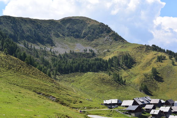 Die Poludnig Alm mit Blick auf den Gipfel.