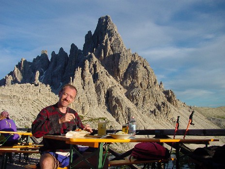 Beim Abendessen vor der herrlichen Kulisse des Paternkofels.